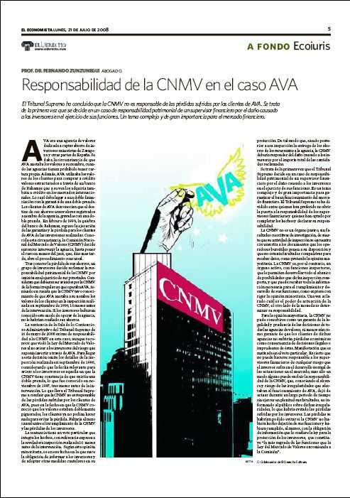 La sentencia de la Sala de lo Contencioso-Administrativo del Tribunal Supremo de 16 de mayo de 2008, exime de responsabilidad a la CNMV en este caso, aunque reconoce que la CNMV violó la Ley del Mercado de Valores al no avisar a los inversores del riesgo que suponía invertir a través de AVA. Para llegar a esta decisión omite los detalles de la inspección realizada en septiembre de 1996, considerando que la fecha relevante para avisar a los inversores es aquella en que la CNMV tiene constancia de que existía una doble prenda, lo que fue conocido en noviembre de 1997, tres meses antes de la intervención. Lo que lleva al Tribunal Supremo a concluir que la CNMV no es responsable de las pérdidas sufridas por los clientes de AVA, pues en la fecha en que la CNMV conoció que los valores estaban doblemente pignorados, los clientes ya no podían hacer nada para evitar la pérdida. Faltaría el nexo causal entre el incumplimiento de la CNMV y las pérdidas de los inversores.