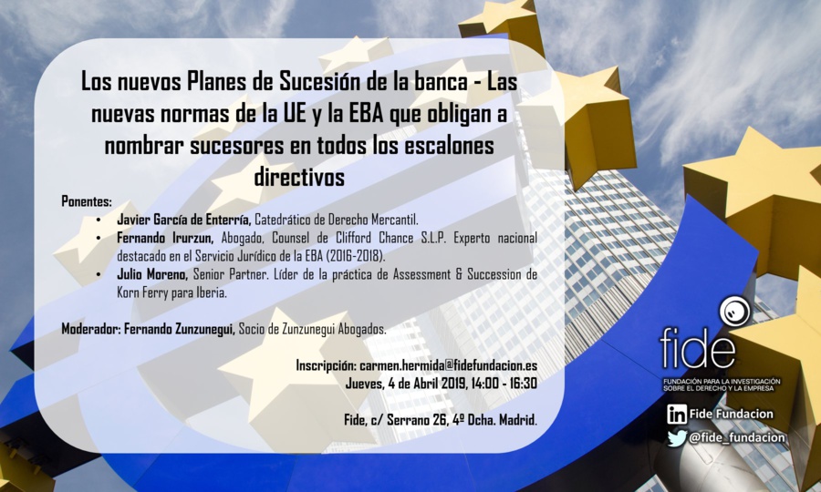 La Fundación para la Investigación sobre el Derecho y la Empresa (Fide) celebrará el jueves 4 de abril una sesión dedicada a los nuevos planes de sucesión de la banca. Como ponentes, participarán Javier García de Enterría, Catedrático de Derecho Mercantil; Fernando Irurzun, Counsel de Clifford Chance y experto nacional destacado en el Servicio Jurídico de la EBA (2016-2018); y Julio Moreno, Senior Partner de Korn Ferry. Fernando Zunzunegui, socio fundador de Zunzunegui Abogados, moderará el debate.